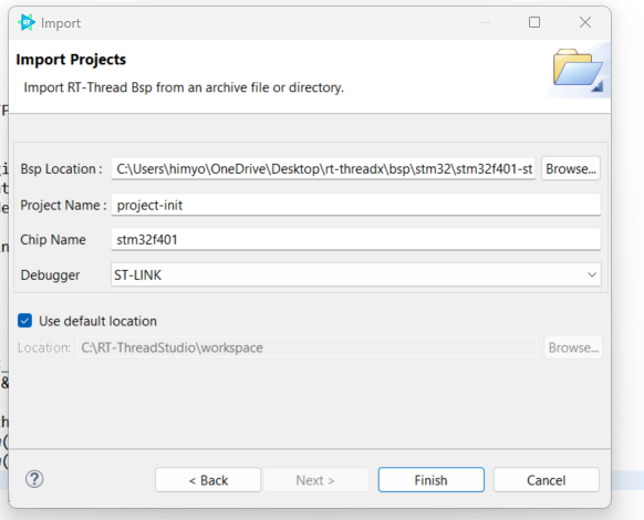 ### 1.4 Browse Bsp Location to rt-threadx\bsp\stm32\stm32f401-st-nucleo, then click Select Folder.