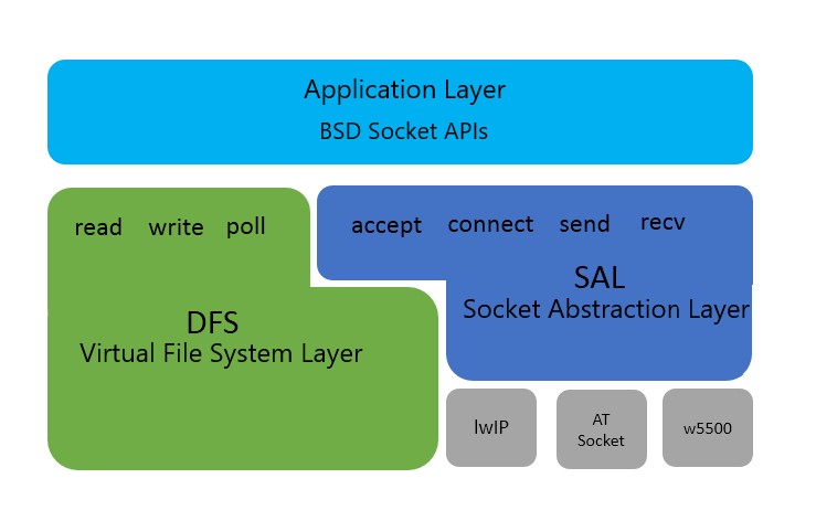 For different protocol stacks or network function implementations, the names of network interfaces may be different. Take the connect connection function as an example. The interface name in the lwIP protocol stack is lwip_connect, and the interface name in the AT Socket network implementation is at_connect. The SAL component provides abstraction and unification of the interface of different protocol stacks or networks. When the socket is created, the component judges the protocol stack or network function used by judging the incoming protocol domain type, and completes the RT-Thread.