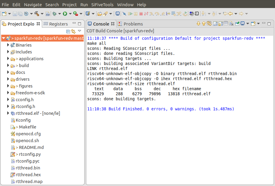 当窗口输出 Build Finished ,左侧文件列表出现 rtthread.elf 文件时,即为编译成功。