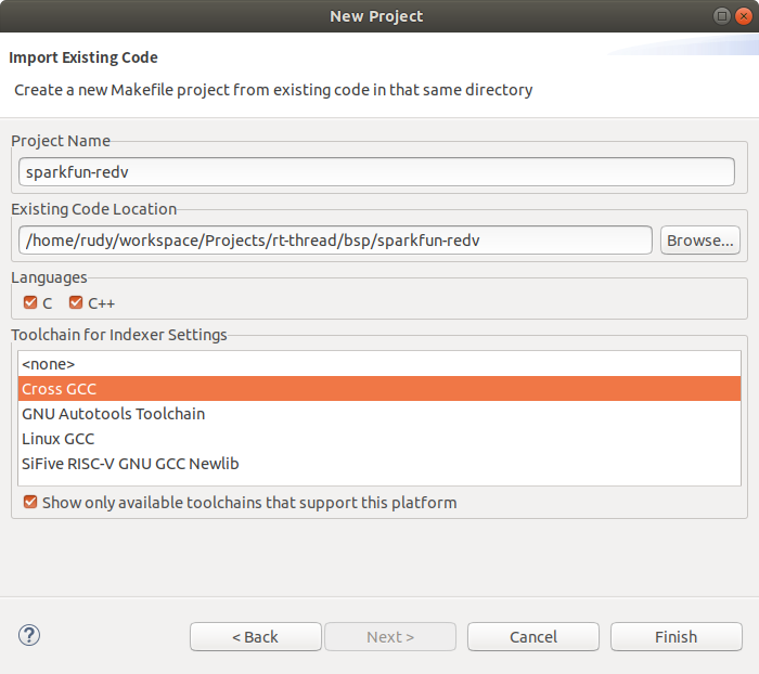 在编辑框中填入 bsp 文件所在目录,选择 Cross GCC ,点击 Finish 导入。