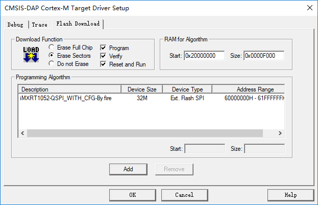 首先需要将需要将 RT1052 的 FLASH 下载算法(board目录下的MIMXRT105x_QuadSPI_4KB_SEC.FLM 文件)拷贝到 MDK 安装路径→ARM→Flash文件夹里面。双击 project.uvprojx 文件,打开 MDK5 工程,按照下图所示选择下载算法并保存设置:
