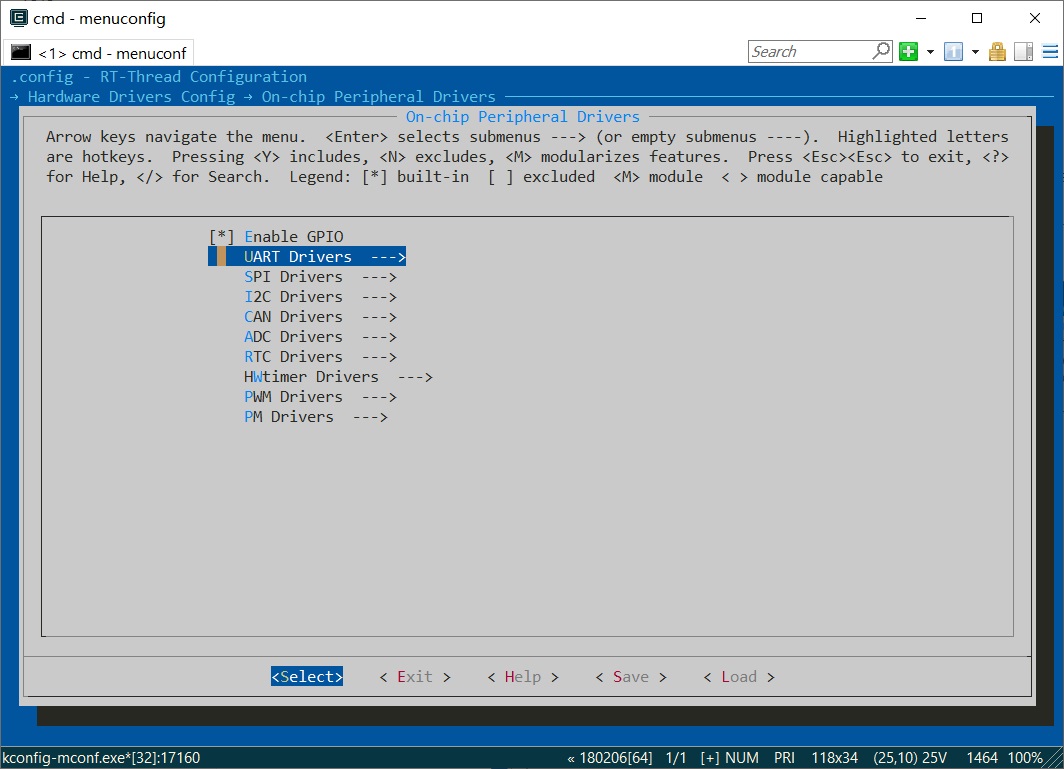 此 BSP 默认只开启了 GPIO 和 uart0 的功能,如果需使用更多高级功能,需要利用 ENV 工具对 BSP 进行配置,步骤如下: