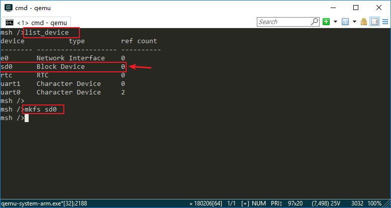 Type list_device to view all devices registered in the system. You can see the virtual SD card "sd0" device as shown in the following picture. Next, we can format the SD card using the mkfs sd0 command, which will format the SD card into a FatFS file system. FatFs is a Microsoft fat-compatible file system developed for small embedded devices. It is written in ANSI C, uses abstract hardware I/O layer and provides continuous maintenance, so it has good portability.