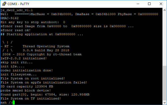 连接好串口,可以使用putty以115200-N-8-1的配置方式连接到设备上。开发板复位后首先运行的是u-boot引导程序,然后再由u-boot跳转到flash中的rtthread.bin固件中。