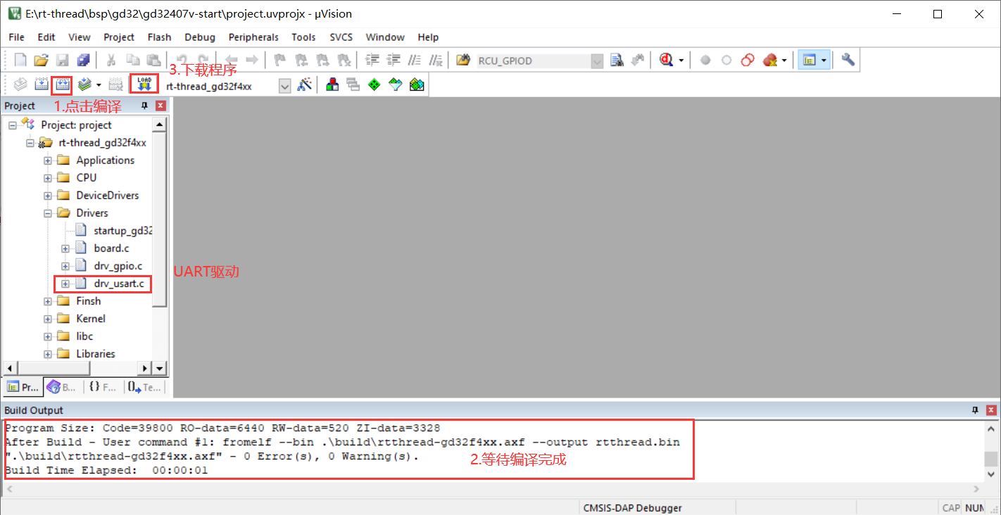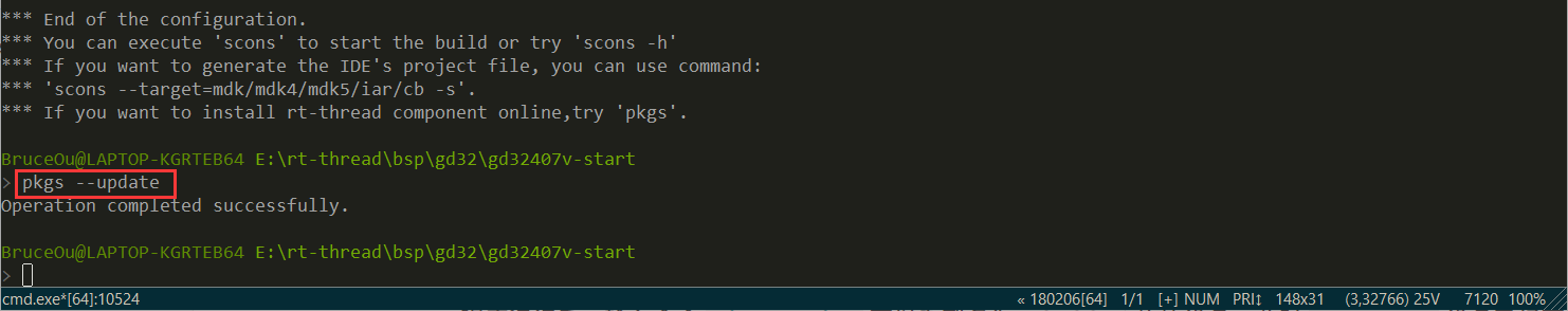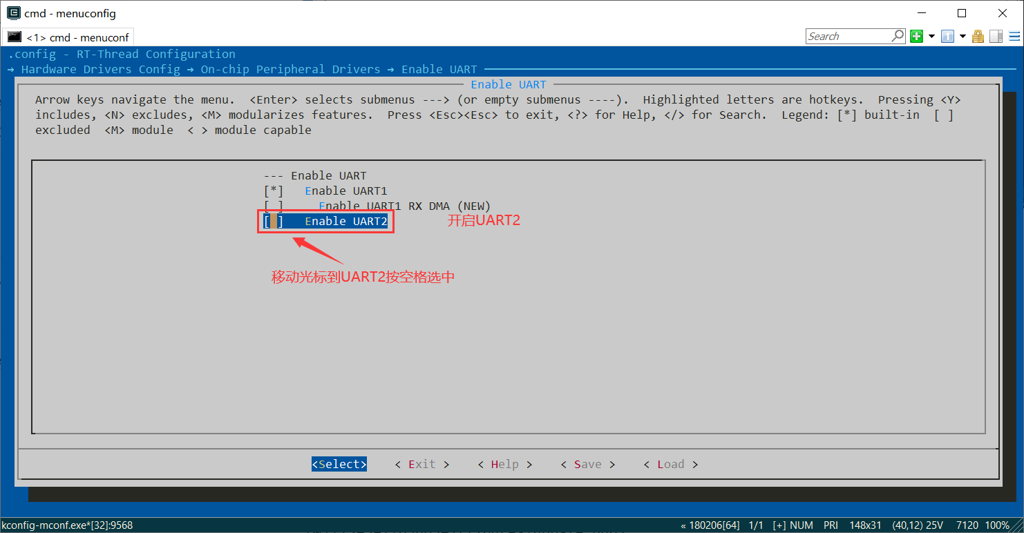 开发板上一般有很多板载资源,如 Flash、SD卡等,但是 BSP 工程默认没有开启这些外设驱动。RT-Thread 提供了 ENV 工具来开启或关闭 BSP 的外设驱动。下面以在GD32407V-START开发板上开启 UART2 驱动为例,一步步的展示如何使用 ENV 工具对 BSP 进行配置。