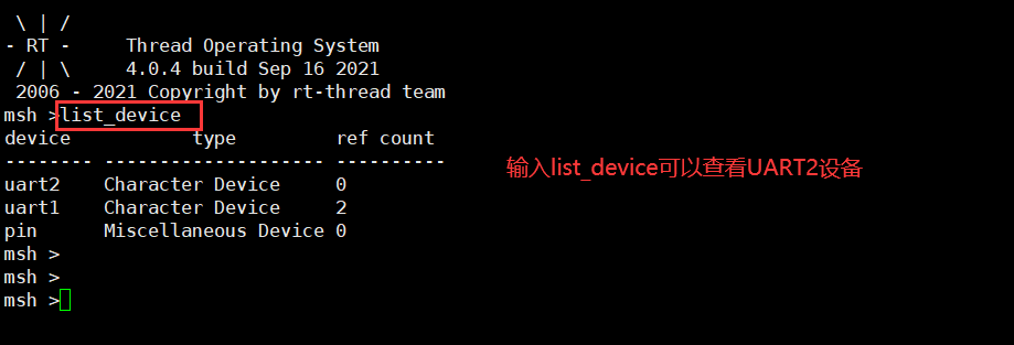 程序运行后,输入命令 list_device 可以看到名为 uart2的设备,此时 UART2 设备已经可以使用了。