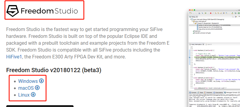 Freedom Studio 是 SiFive 公司推出的一个集成开发环境,用来编写和调试基于 SiFive 处理器的软件。内嵌了编译好的 RISC-V GCC 工具链、OpenOCD、以及一些示例和文档。