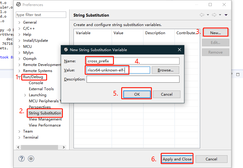 点击菜单栏 Window->preferences 按下图的步骤将 字符串 cross_prefix 定义为 riscv64-unknown-elf-