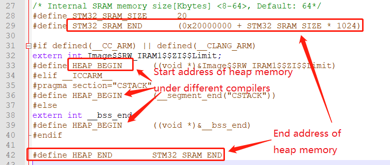 Normally, a part of the memory space in the system RAM will be used as heap memory. The function of the following code is to specify the start address HEAP_BEGIN and end address HEAP_END of the heap memory under different compilers. The values of HEAP_BEGIN and HEAP_END here need to be consistent with the configuration modified in the following section 3.4.1 Modify Link Script.