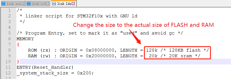 The other two link script files are link.icf used by IAR and link.lds used by the GCC compiler. The modification method is similar, as shown in the following figure: