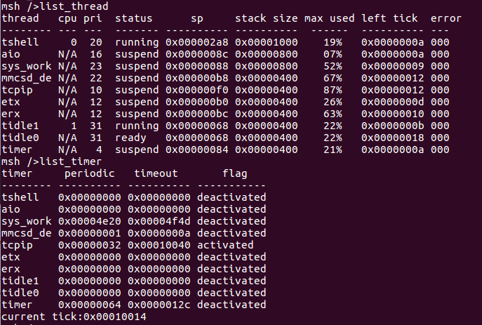 For example, by entering the list_thread command, you can see the currently running threads, thread status and stack size; by entering the list_timer, you can see the status of the timers.