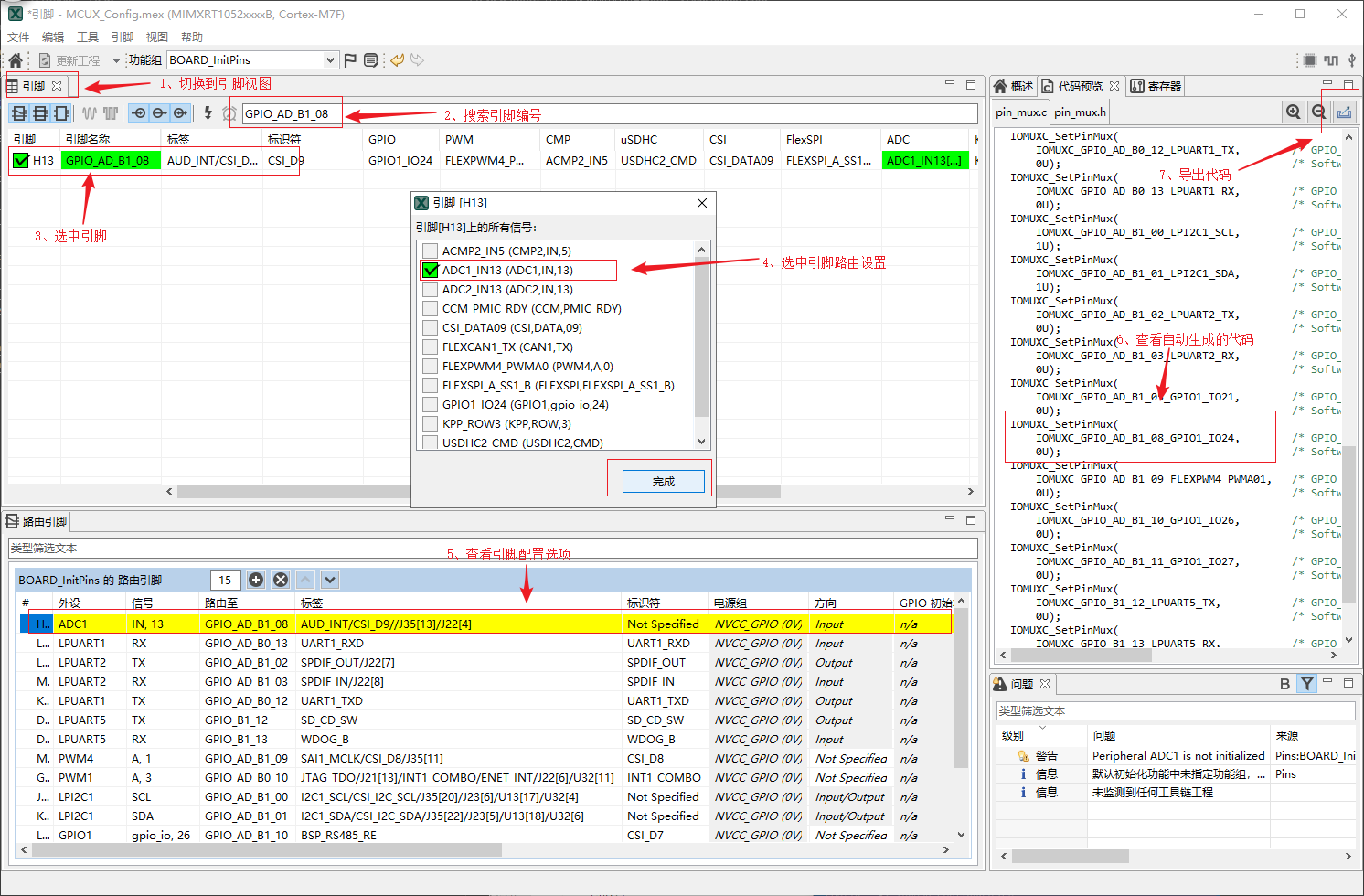 | 7 | ADC | 配置所需要的引脚(或者使用默认引脚),详细内容可参考5.3章节 |