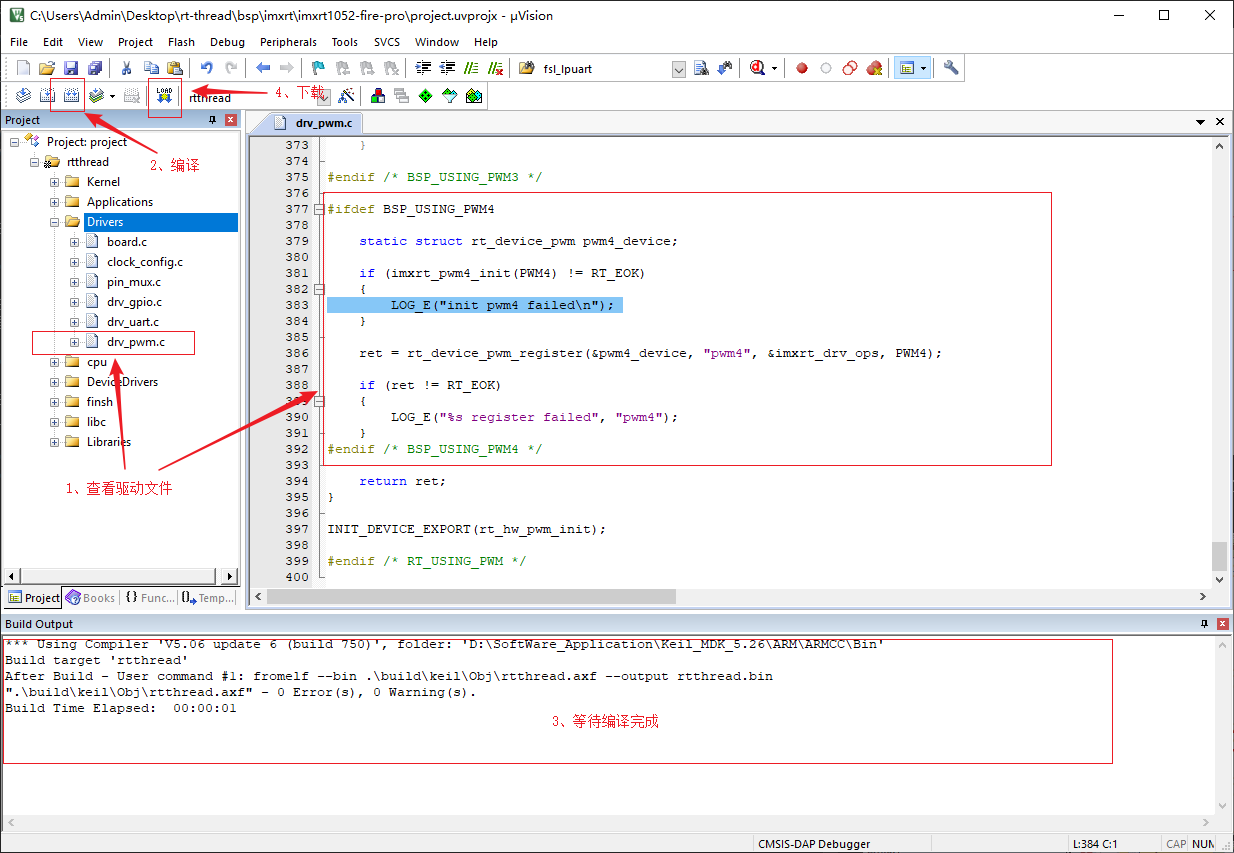 为 BSP 添加驱动时,MCUXpress工具可以快速的完成配置管脚的工作。而外设初始化,中断配置,DMA配置等等则由 RT-Thread 提供的驱动文件来完成。