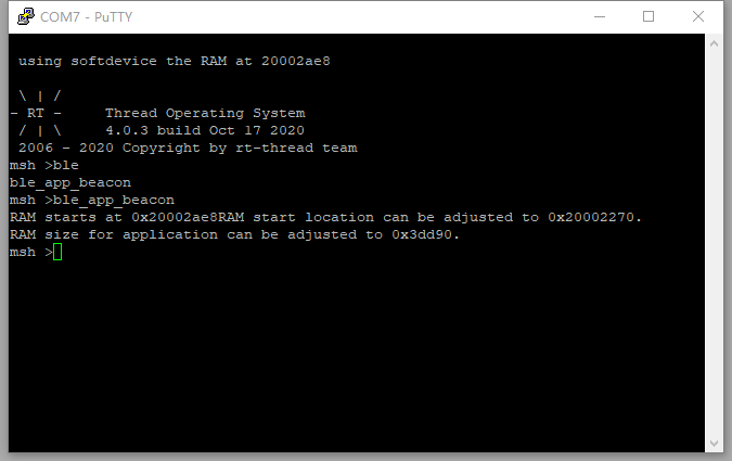 git clone https://github.com/RT-Thread/rt-thread.gitrt-thread/bsp/nrf5x/nrf52840pkgs --update 下载对应的硬件软件包(这里的HAL库采用软件包的方式,需要客户自行下载)scons --target=mdk5 生成keil工程,烧入即可看到LED小灯闪烁首先可以熟悉上述工程的运行,在上述运行的基础上,我们可以试着跑一下ble_app_beacon(这个在SDK16.0中的peripheral 的sample中)