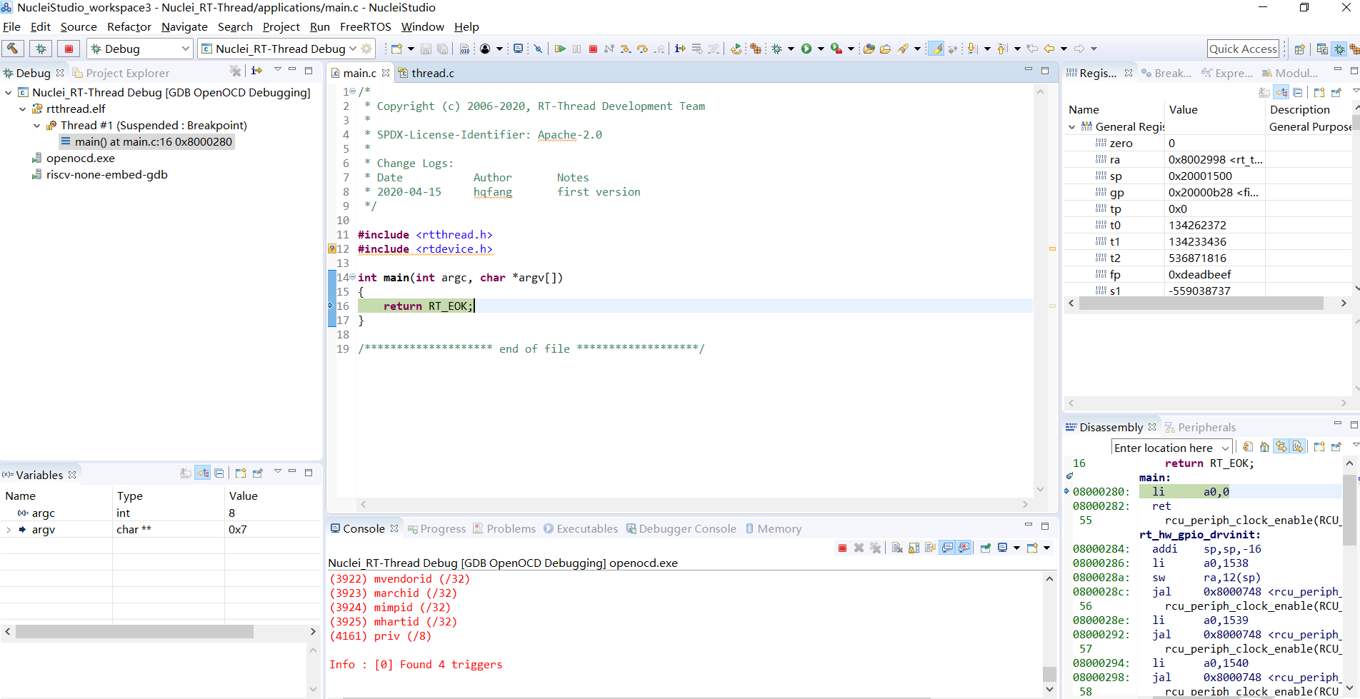 Breakpoint 1 at 0x8003840: file D:\workspace\Sourcecode\rt-thread\libcpu\risc-v\nuclei\interrupt_gcc.S, line 190.