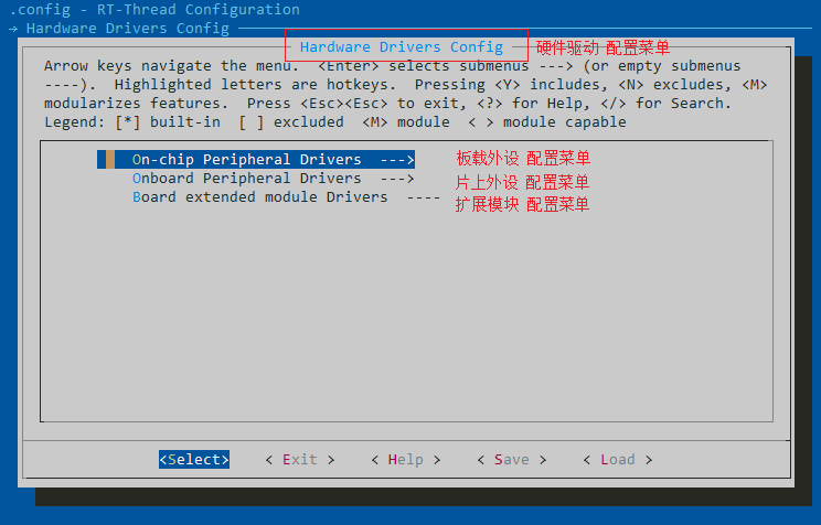 在硬件配置菜单里有三个选项,分别是 板载外设配置菜单、片上外设配置菜单和扩展模块配置菜单,按回车键进入板载外设配置菜单。
