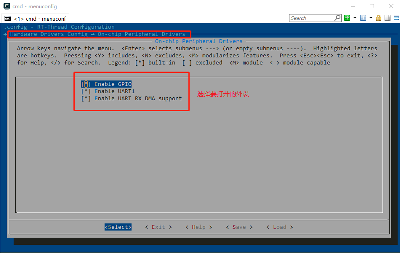 在 Env 界面输入命令 menuconfig 对工程进行配置,并生成新的 rtconfig.h 文件。如下图所示:
