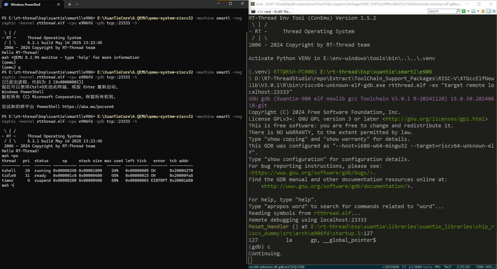 riscv64-unknown-elf-gdb.exe rtthread.elf -ex "target remote localhost:23333"