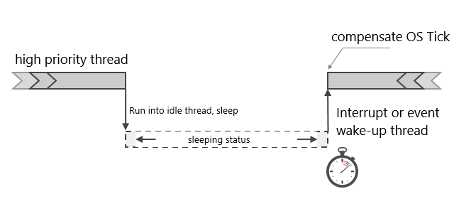 As shown in the figure above, when the high priority thread runs out or is suspended, the system enters the IDLE thread . After the IDLE thread is executed, it will determine whether the system can go to sleep (to save power). If the system goes to sleep, Some hardware modules will be shut down depending on the chip condition, and OS Tick is also very likely to enter a pause state. At this time, the power management framework will calculate the next timeout point according to the system timer situation, and set a low-power timer, so that the device can wake up at that point, and carry out follow-up work. When the system is awakened (low power timer interrupt or other wake-up interrupt source), the system also needs to know how long it sleeps, and compensate for OS Tick, so that the OS tick value of the system is adjusted to a correct value.
