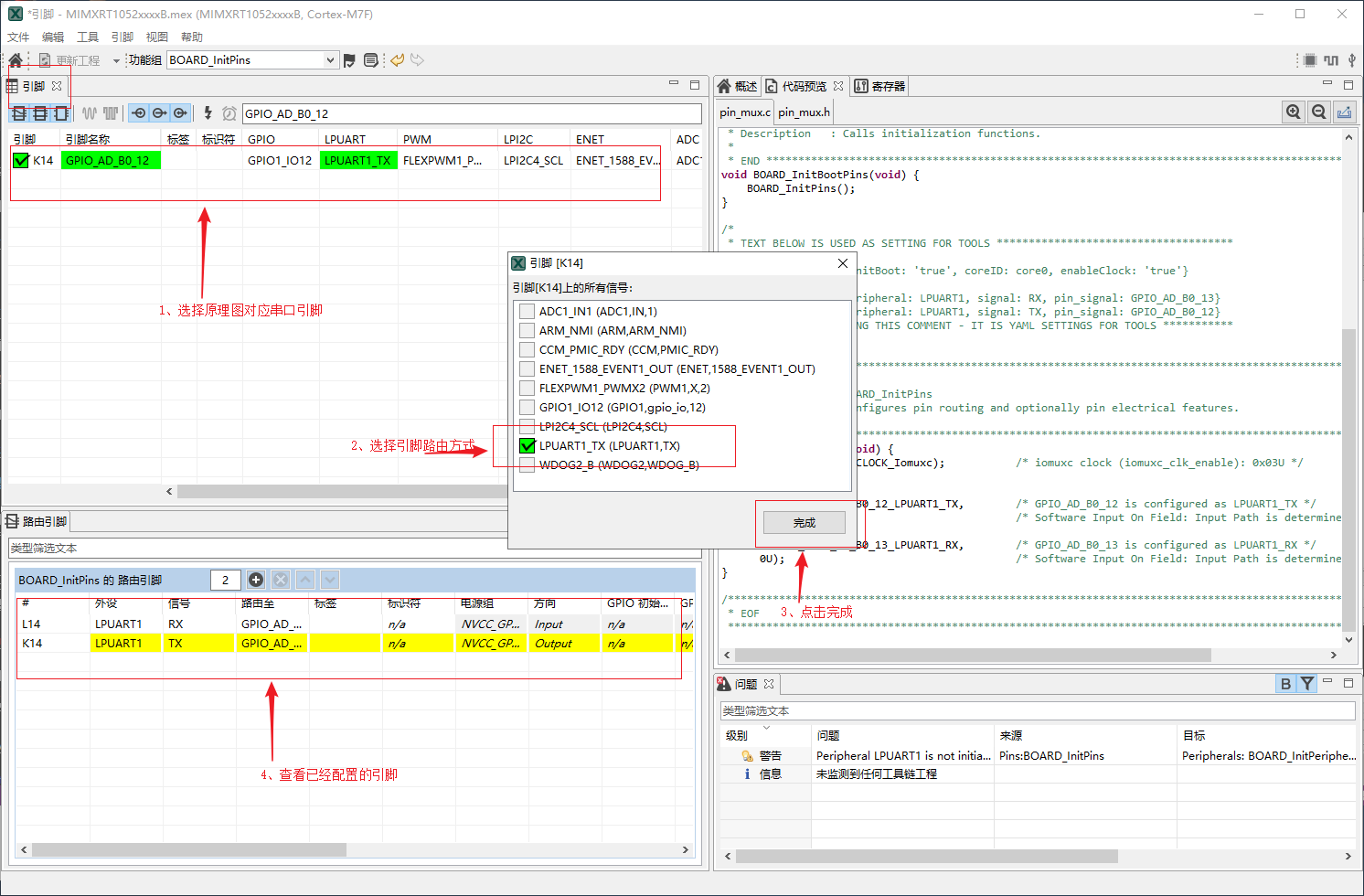 • 使用 MCUXpresso 工具配置引脚及时钟。