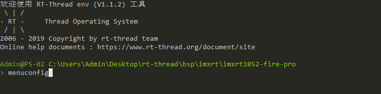在 Env 界面输入命令 menuconfig 对工程进行配置,并生成新的 rtconfig.h 文件。如下图所示: