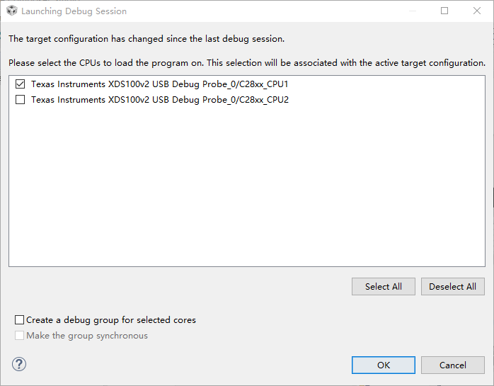 在弹出的 Launching Debug Session 对话框中可以选择要调试的 CPU 核和 CLA 核,这里我们只选择 C28xx_CPU1,点击 OK 开始下载和调试。