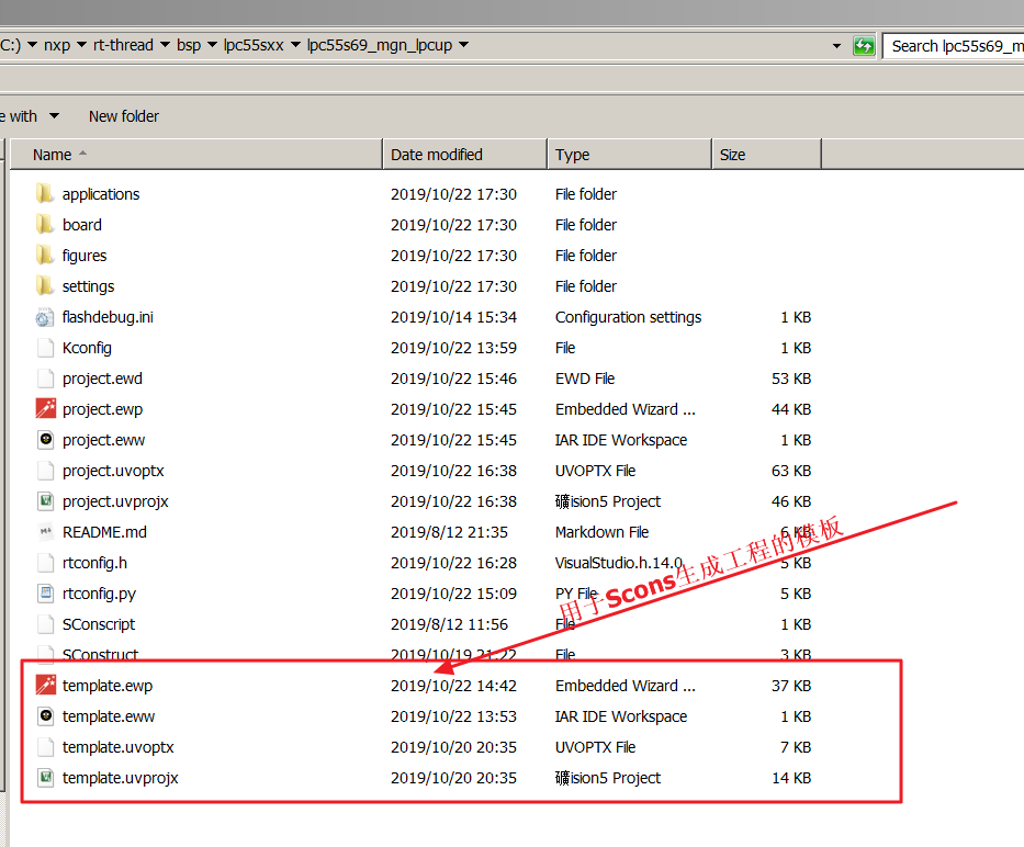 本次示例所用的 LPC55S6x 系列 BSP 模板文件夹结构如下所示: