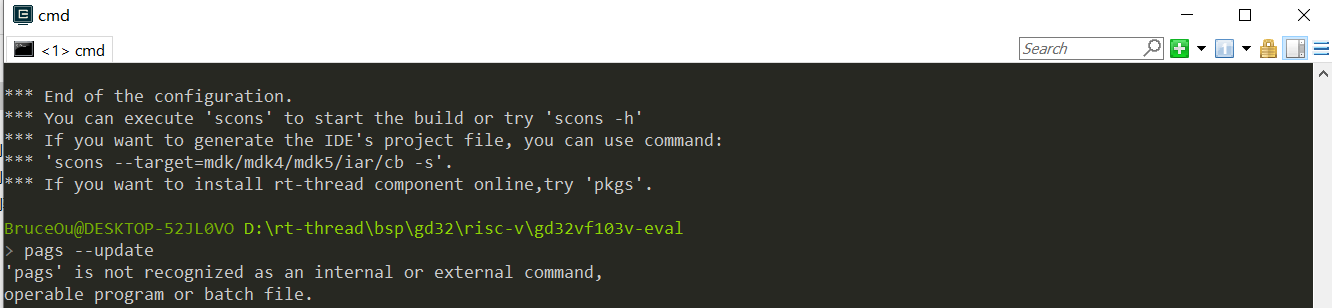 开发板上一般有很多板载资源,如 Flash、SD卡等,但是 BSP 工程默认没有开启这些外设驱动。RT-Thread 提供了 ENV 工具来开启或关闭 BSP 的外设驱动。下面以在GD32VFf103V-EVAL开发板上开启 UART1驱动为例,一步步的展示如何使用 ENV 工具对 BSP 进行配置。