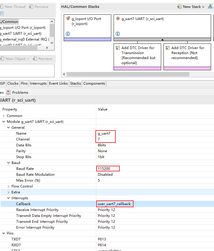 配置 UART 参数,因为需要适配 RT-Thread 驱动中使用的命名,所以需要修改命名,设置name 、channel 、callback 为一致的标号。
