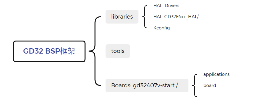 GD32的BSP架构主要分为三个部分:libraries、tools和具体的Boards,其中libraries包含了GD32的通用库,包括每个系列的HAL以及适配RT-Thread的drivers;tools是生成工程的Python脚本工具;另外就是Boards文件,当然这里的Boards有很多,我这里值列举了GD32407V-START。