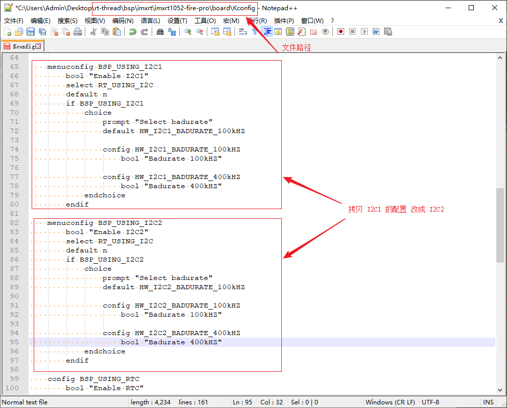 打开 board 文件夹下的 Konfig 文件,拷贝 I2C1 的配置项,并重命名 I2C1 为 I2C2。