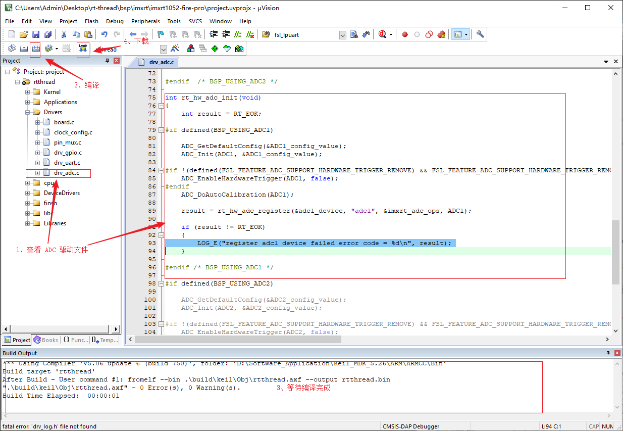 为 BSP 添加驱动时,MCUXpress工具可以快速的完成配置管脚的工作。而外设初始化,中断配置,DMA配置等等则由 RT-Thread 提供的驱动文件来完成。