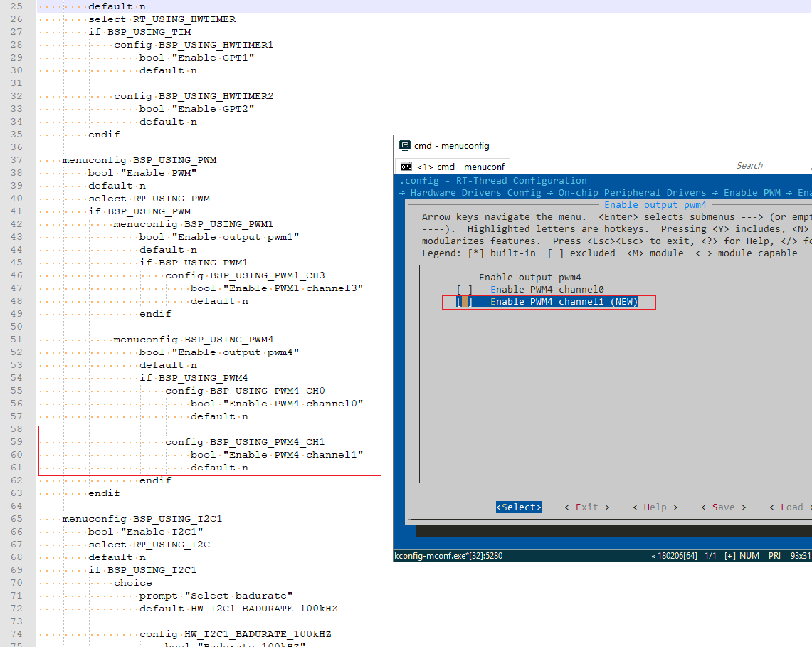 经过上一步的修改,此时重新打开 ENV 工具,在 menuconfig 中就会出现添加的 I2C2 的配置项。