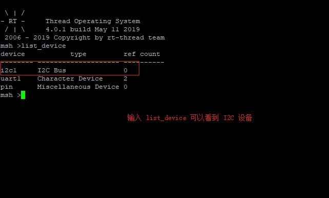 程序运行后,输入命令 list_device 可以看到名为 I2C 的块设备,MPU6050 通信选择的是 I2C 通信,此时 MPU6050 已经可以使用了。