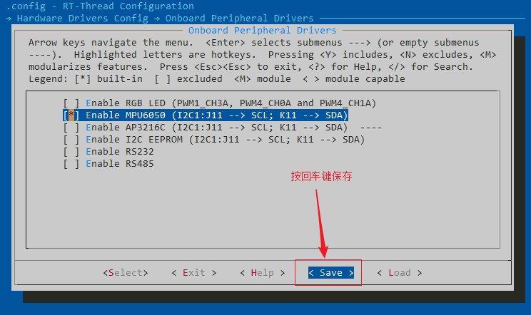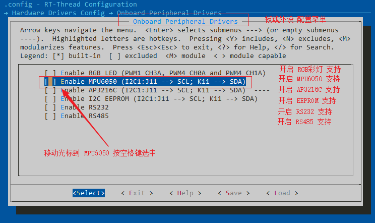 在硬件配置菜单里有三个选项,分别是 板载外设配置菜单、片上外设配置菜单和扩展模块配置菜单,按回车键进入板载外设配置菜单。