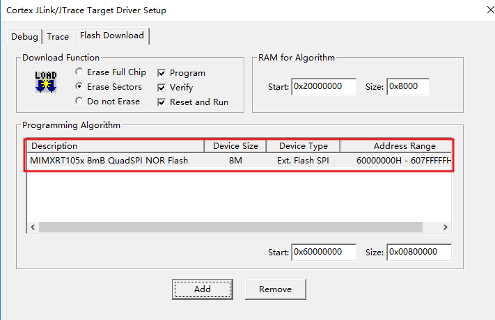首先需要将需要将 RT1052 的 FLASH下载算法(board目录下的 MIMXRT105x_QuadSPI_4KB_SEC.FLM 文件)拷贝到 MDK 安装路径→ARM→Flash文件夹里面。双击 project.uvprojx 文件,打开 MDK5 工程,按照下图所示选择下载算法并保存设置: