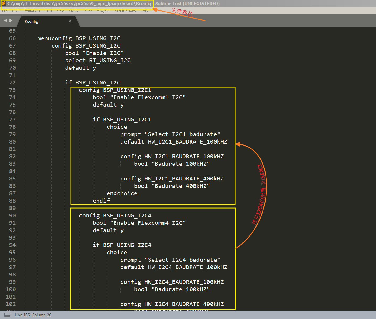 经过上一步的修改,此时重新打开 ENV 工具,在 menuconfig 中就会出现添加的 I2C4 的配置项。