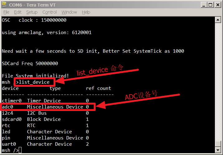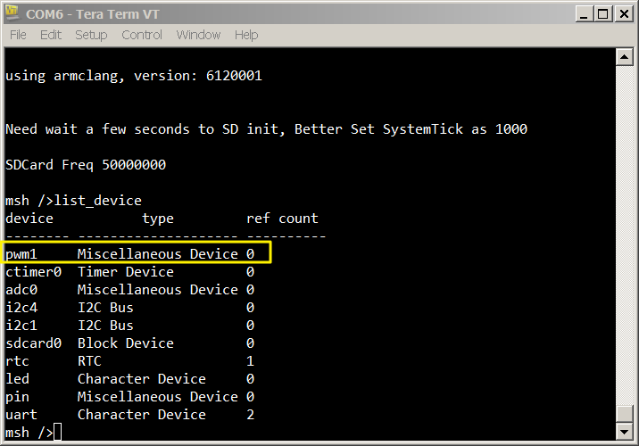 list_device 命令,可以看到 gpt1 设备已经注册到内核,说明驱动已经添加成功。list_device 命令,可以看到 pwm 设备已经注册到内核,说明驱动已经添加成功。list_device 命令,可以看到 adc0 设备已经注册到内核,说明驱动已经添加成功。