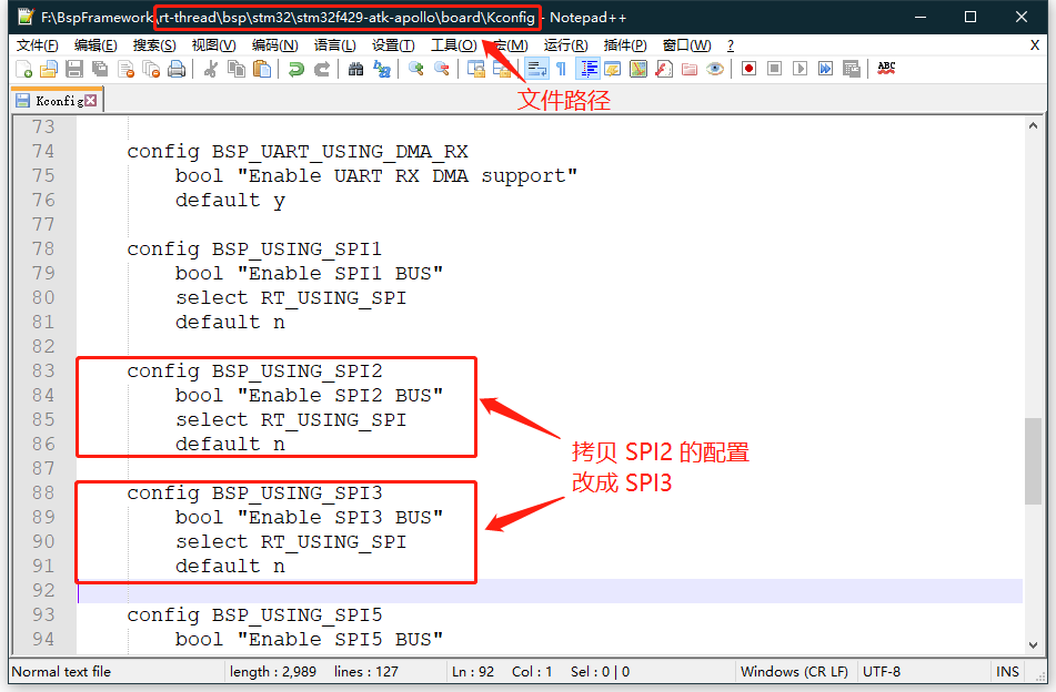 打开 board 文件夹下的 Konfig 文件,拷贝 SPI2 的配置项,并重命名 SPI2 为 SPI3。
