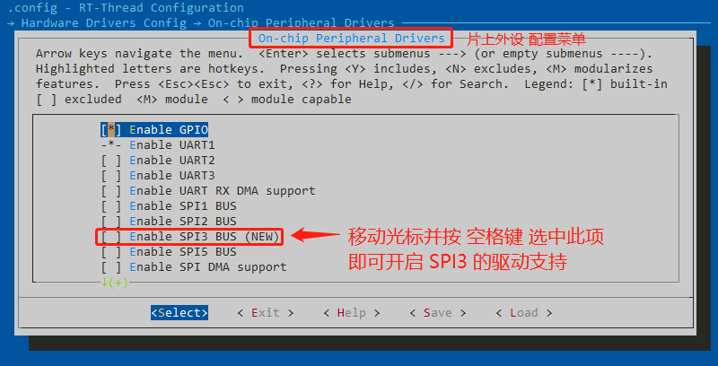 经过上一步的修改,此时重新打开 ENV 工具,在 menuconfig 中就会出现添加的 SPI3 的配置项。