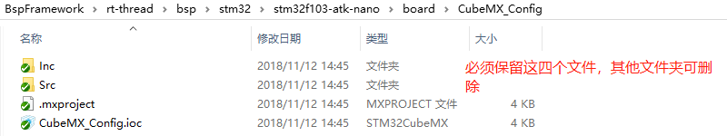 在接下来的 BSP 的制作过程中,将会修改 board 文件夹内的配置文件,将 F1 系列的 BSP 模板变成一个适用于正点原子 stm32f103-atk-nano 开发板的 BSP ,下表总结了 board 文件夹中需要修改的内容:
