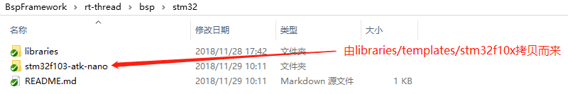 本次制作的 BSP 为 F1 系列,因此拷贝模板文件夹下的 stm32f10x 文件夹,并将该文件夹的名称改为 stm32f103-atk-nano ,如下图所示: