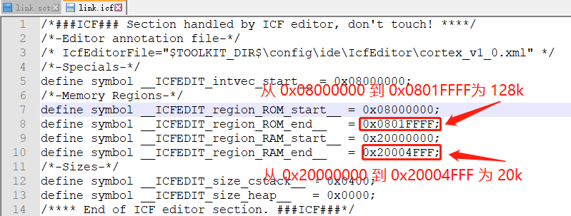 其他两个链接脚本的文件分别为 iar 使用的 link.icf 和 gcc 编译器使用的 link.lds,修改的方式也是类似的,如下图所示: