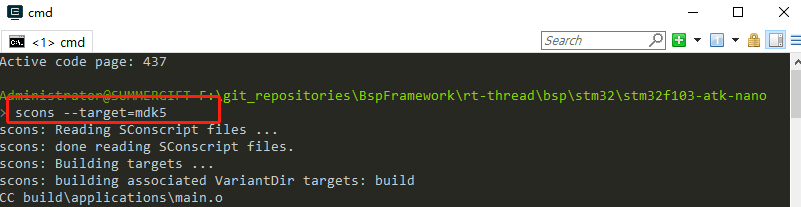 使用 env 工具输入命令 scons --target=mdk5 重新生成工程,如下图所示: