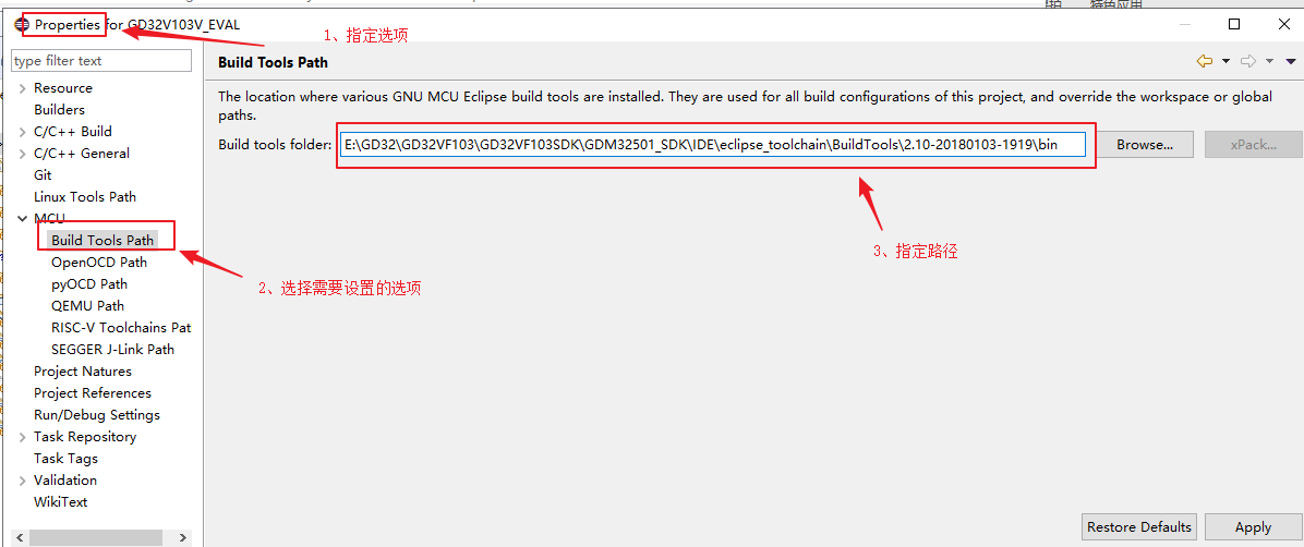 点击 MCU 列表中的 Build Tools Path 选项,为其选择 SDK 文件包中提供的对应工具