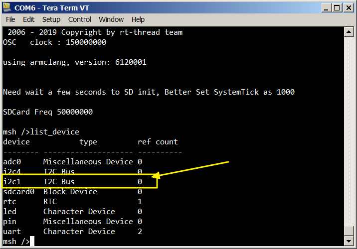 检查完工程后,编译下载到开发板,程序会自动开始运行。输入 list_device 命令,可以看到 I2C1 总线已经注册到内核,说明驱动已经添加成功。