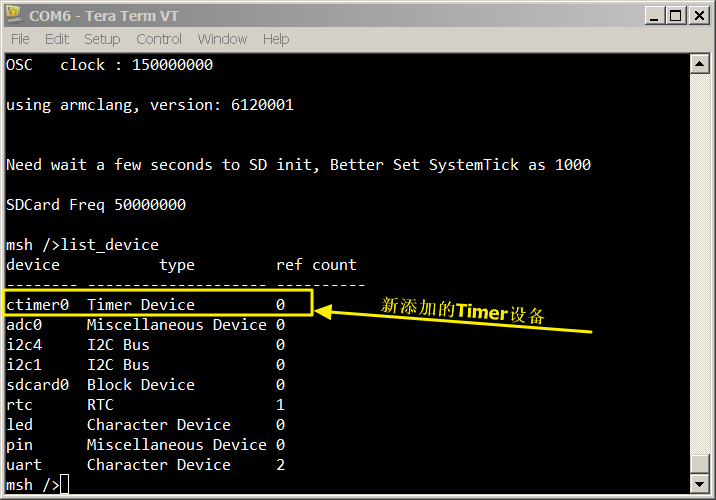 list_device 命令,可以看到 gpt1 设备已经注册到内核,说明驱动已经添加成功。list_device 命令,可以看到 pwm 设备已经注册到内核,说明驱动已经添加成功。list_device 命令,可以看到 adc0 设备已经注册到内核,说明驱动已经添加成功。