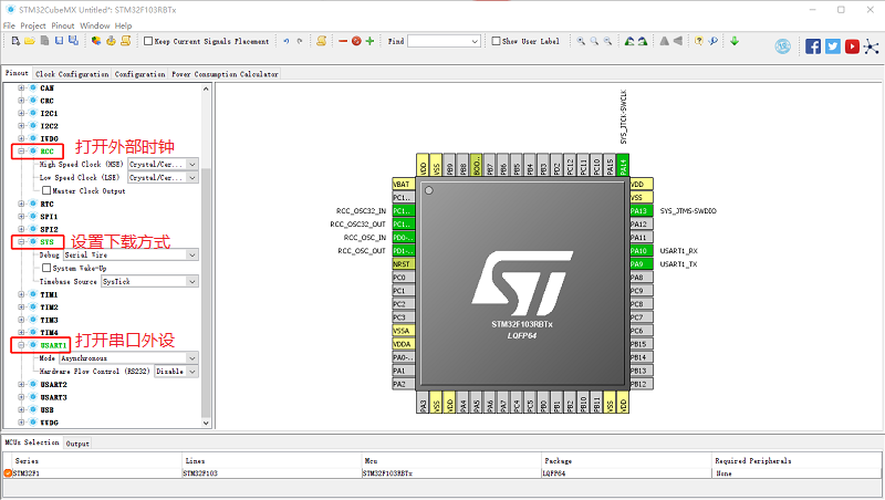 1. 打开外部时钟、设置下载方式、打开串口外设(注意只需要选择串口外设引脚即可,无需配置其他参数):