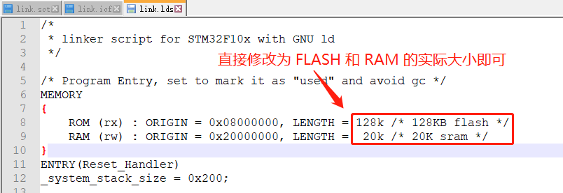 其他两个链接脚本的文件分别为 iar 使用的 link.icf 和 gcc 编译器使用的 link.lds,修改的方式也是类似的,如下图所示: