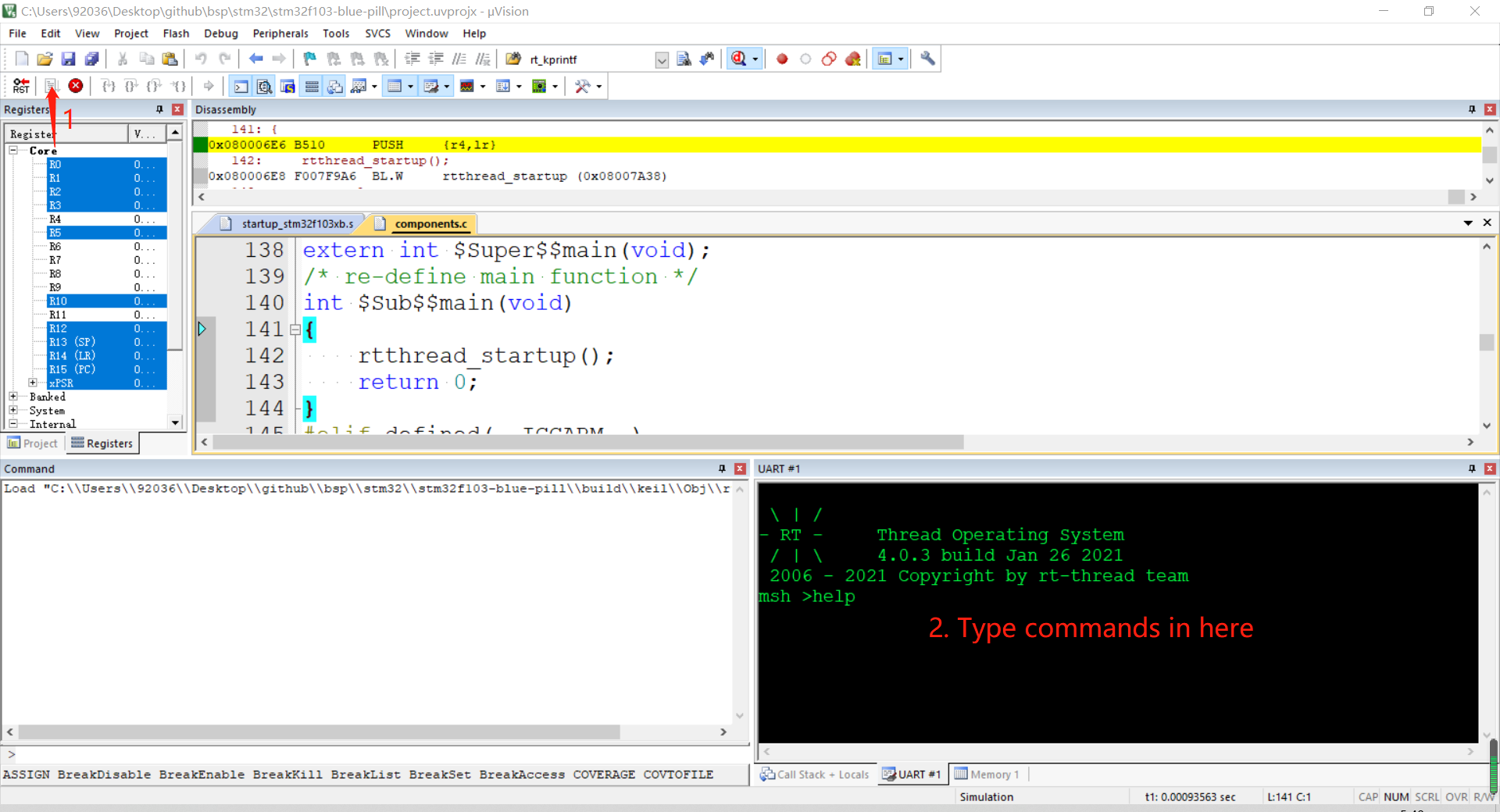 If you haven't had a real Blue Pill Board yet, you may use MDK-Keil5 simulator to simulate to run RT-Thread on Blue Pill Board. Please Double-click the project.uvprojx file to open the MDK-Keil5 project (NOT template.uvprojx file).